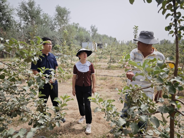 程少波与白茹副教授深入红枣绿色种植园、优质石榴产区及规模化苹果园,细致观察果树长势、土壤墒情、病虫害防治现状及水肥管理措施。白茹副教授结合现场情况,就提升标准化种植水平、优化品种结构、科学应对气候变化影响等关键环节,与种植户及合作社技术人员进行了深入交流,并现场示范了部分高效栽培技术要点。