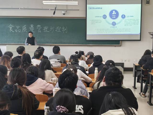 “食品安全是民生工程的重中之重,而质量管理则是守护这份安全的核心线。”讲座开篇,任经理便结合天山云牧在乳制品加工领域的多年实践,点明了食品质量控制的战略意义。她以天山云牧的管理为例,阐述了供应商准入审核、原料验收标准化及仓储“先进先出”原则的重要性。结合具体案例,让同学们对原料控制的严谨性有了直观认知,让抽象的理论变得具象可感。