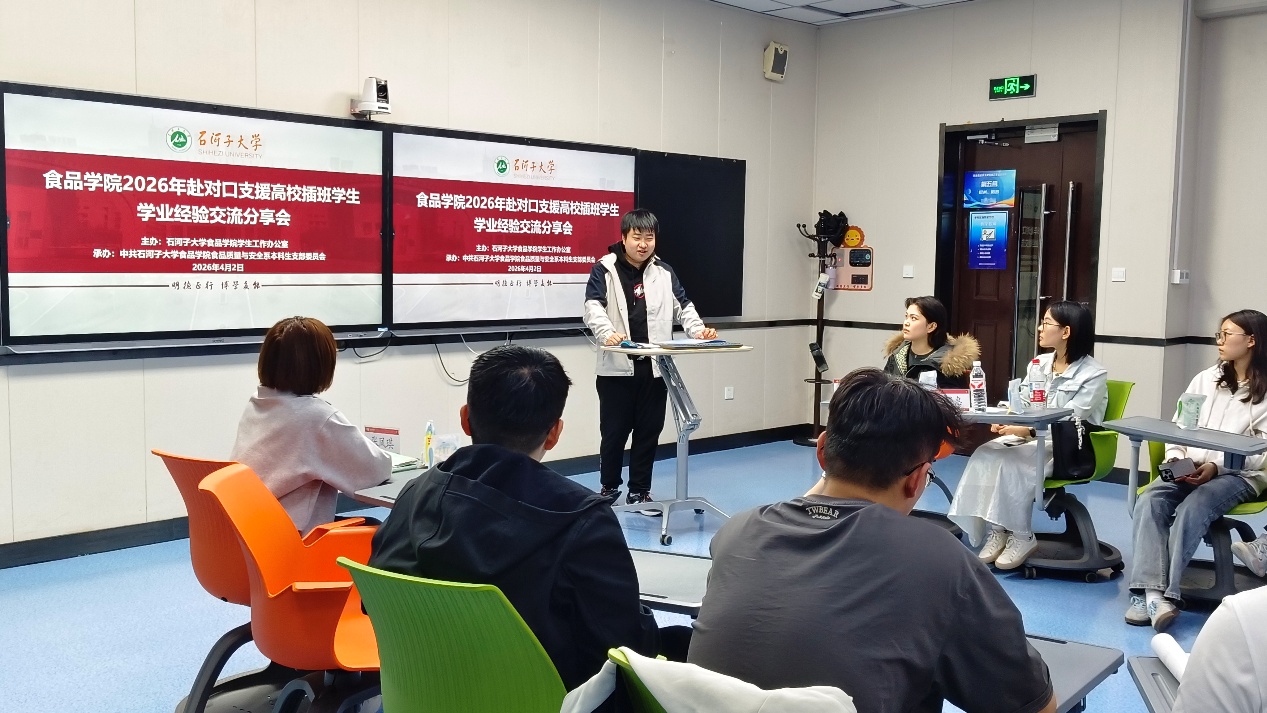 为精准护航拟插班学子平稳过渡、高效衔接学业,42日晚,食品学院在博A211教室举办2026年赴对口支援高校插班学生学业经验交流分享会。本次活动由学院学生工作办公室主办、食品质量与安全系本科生党支部承办。学院党委副书记丁成、食品质量与安全系本科生党支部书记叶里克什·吐尔松、2024级及2025级拟插班学生参会。